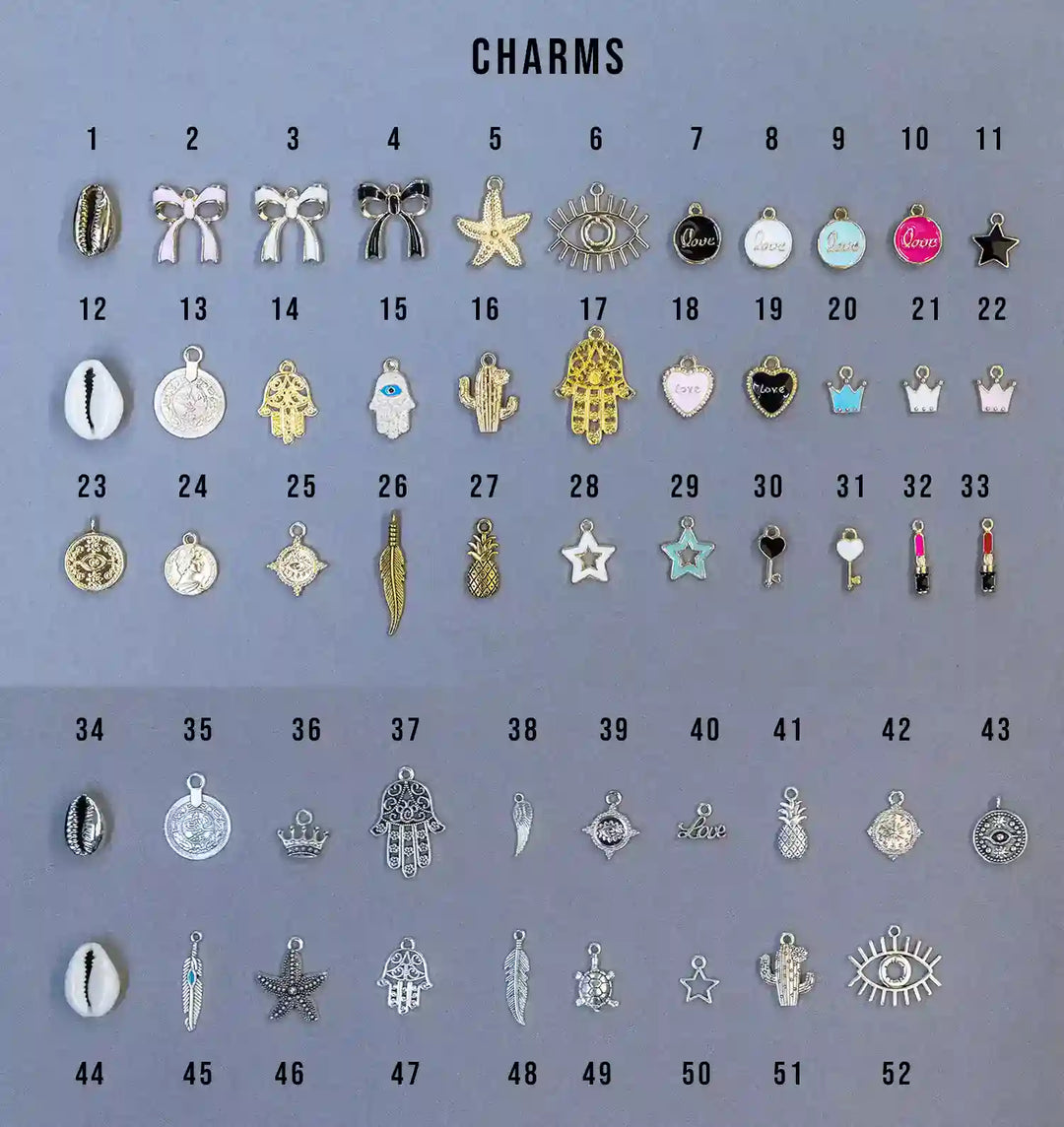 - Wähle 6 Charms: 1, 4, 5, 7, 12, 16 (Du kannst auch nur 1 oder 2 Stile wählen, wie z.B.: 6 x 12 oder 3 x 11 + 3 x 18 )